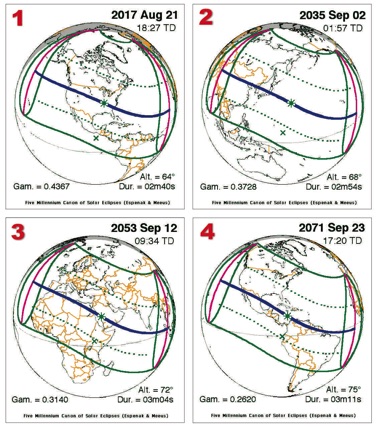 Note that the Sept. 23, 2071 solar eclipse will have shifted south in location from the similar Aug. 21, 2017 solar eclipse. The reason for this is that the length of the Saros cycle is 18 years and 11 1/3 days; the extra 11 1/3 days in the Saros cycle means that each succeeding eclipse will now occur later in the year than previous eclipses. The shifting locations of the Earth and the Moon in their orbits in this extra time interval accounts for the change in the exact eclipse path location.